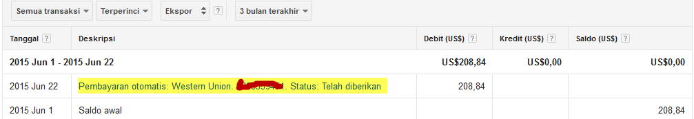 Kabar baik! Pada tanggal 2015 Jun 22, kami telah mengirimkan pembayaran penghasilan Google AdSense Anda"